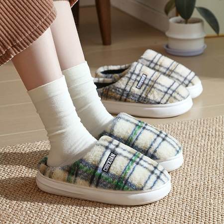冬季毛绒棉拖鞋 复古格纹保暖情侣款